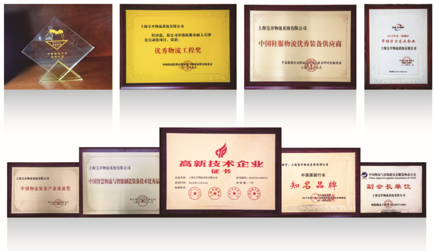 作为上海市高新技术企业、ISO认证企业、双软认证企业 ,宝开多项核心技术已获得国家专利,同时,宝开是中国物流与采购联合会服装物流分会副会长单位,中国仓储配送协会家居物流分会会员单位,《物流技术与应用》杂志理事单位,荣获“2016年长三角地区市场活力龙头企业”、“2016-2017年度中国物流行业金蚂蚁奖”、“全国发明金奖”(AS/RS立体仓库系统在纺织行业的应用)、“2018致敬改革开放中国鞋服供应链与物流优秀集成商”、“2018中国制造业优秀物流工程奖”、“2019鞋服供应链与物流优秀供应商”、“2019物流装备产业产品技术创新奖”、2020年吴泾地区“创新活力奖”等多项荣誉。